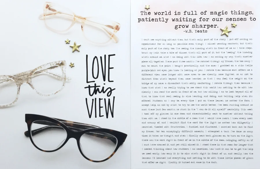 I started out with a favorite quote from Yeats, and then decided on a two page spread when my journaling, as is usual, got a little lengthy. It turned out to be just perfect to have two pages, because collecting some of my favorite pairs of glasses and capturing them in one spot was a fun way to make sure I get them in the books since I am not always wearing them when I add a photo of myself. This is what I love about really simple hybrid design when scrapbooking - all it took was adding Ali's simple digital stamp, and then a few chipboard stars to give the pages more personality without taking away from the story.
